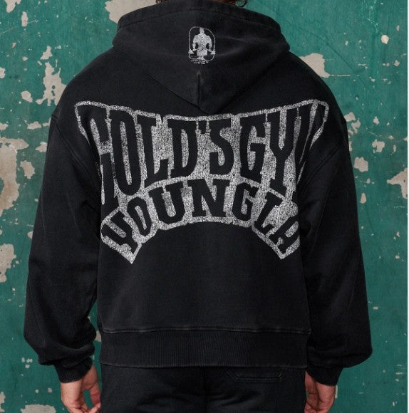 DESIGN: This zip-up hoodie from the Gold’s Gym x YoungLA collaboration combines classic gym style with modern streetwear. Featuring an oversized fit and a washed fabric for a vintage vibe, it’s designed for maximum comfort and a laid-back look. The back showcases a bold, distressed Gold's Gym x YLA graphic, adding a statement piece to your wardrobe.